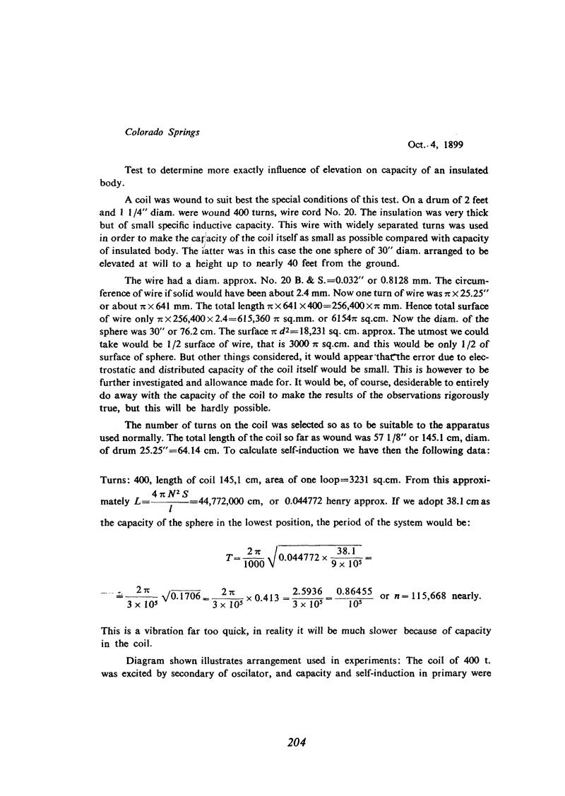 He performs the experiments in order to determine the variations of capacitance.of and isolated metal body at various distances from the ground surface. He constructs the ''special coil'' which is connected between the secondary and the globe. He particularly makes efforts to reduce the internal coil capacitance.