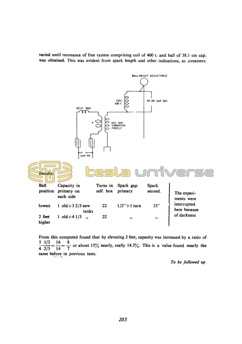 varied until resonance of free system comprising coil of 400 t. and ball of 38.1 cm cap. was obtained. This was evident from spark length and other indications, as streamers.