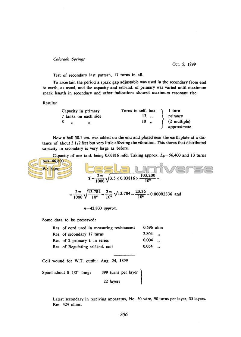 Tesla checks the secondary coil adjustment. The procedure is already standard. He adjusts the capacitance and inductance in the primary (with coil of variable inductance connected in series) until he achieves the maximum sparks at the secondary terminals. Operating frequency is approximately calculated on the basis of total inductance and capacitance in the primary. The influence of the secondary adjustment to oscillation is checked by a sphere addition of 38.1 cm in diameter and because that has very little influence he draws the conclusion that the distributed secondary capacitance is large.