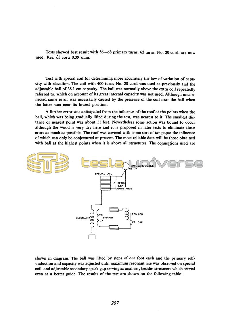 The ball was lifted by steps of one foot each and the primary self-induction and capacity was adjusted until maximum resonant rise was observed on special coil, and adjustable secondary spark gap serving as analizer, besides streamers which served even as a better guide. The results of the test are shown on the following table: