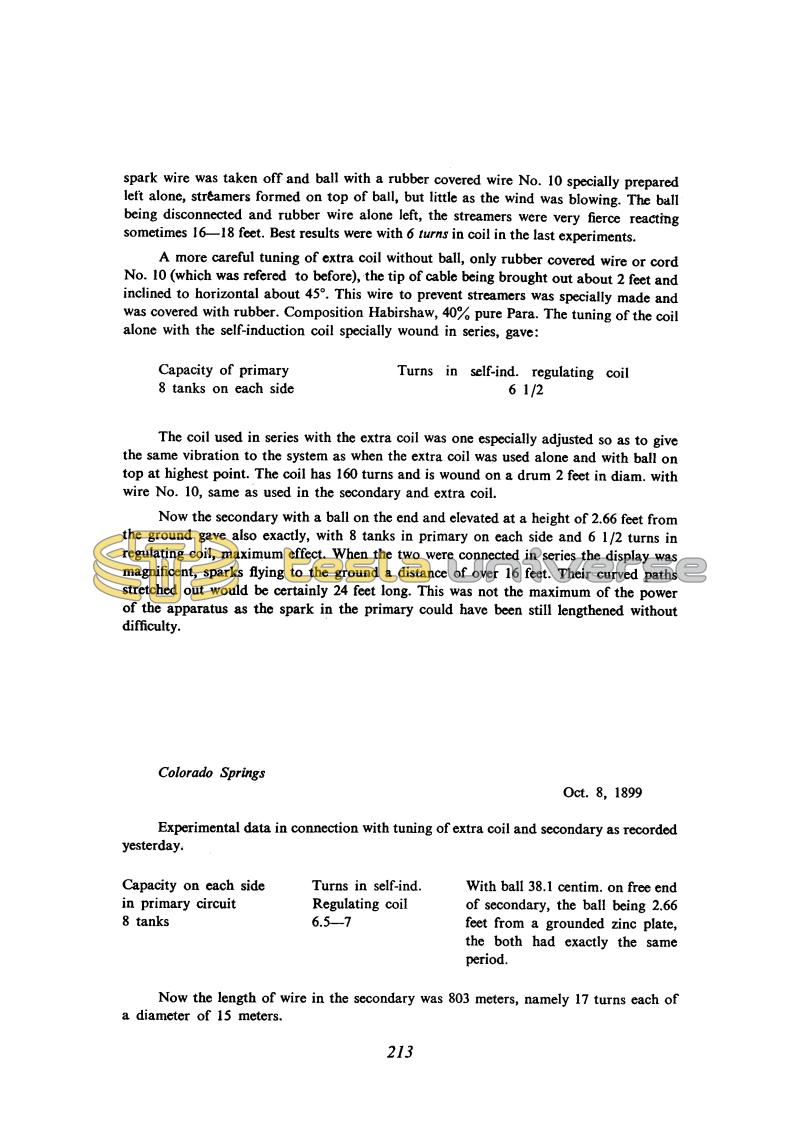 A more careful tuning of extra coil without ball, only rubber covered wire or cord No. 10 (which was referred to before), the tip of cable being brought out about 2 feet and inclined to horizontal about 45°. This wire to prevent streamers was specially made and was covered with rubber. Composition Habirshaw, 40% pure Para. The tuning of the coil alone with the self-induction coil specially wound in series, gave: