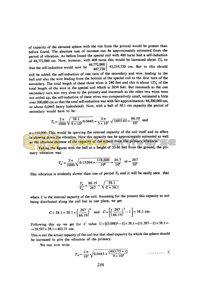 Division of this equation by the previous one results in: c' = Lp2(c + C) - C, which corresponds to Tesla's equation from which c' is determined. Due to a calculation error when C was calculated, Tesla's various results for the sphere capacitance are higher by approximately 10%, but this does not essentially change the main conclusions. When calculating the coil distributed capacitance* he uses the relation LpCp = Lsc(c + C) for the sphere at a height, where he considers that its capacitance is close to the theoretical value for the remote sphere.