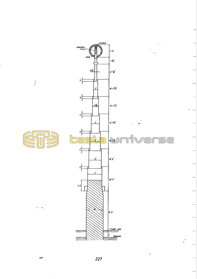He gives a description of a metal pole 43.3 meters in height with a metal globe 67.2 cm in diameter at the top. This is the aerial which could be seen in the middle of the laboratory on the many photographs. The insulator at the bottom of the aerial is a wood-pole stub. The structure is actually a monopole aerial of small electrical length. At the approximate maximum frequencies with which Tesla operated, the ratio H/λ). is approx. 0.015. Due to the terminal capacitance the effective aerial height is somewhat larger than H/2 but even in that case an electrically small aerial is being questioned. The main reason for the construction of this aerial is the testing of the "vibrations in the ground".