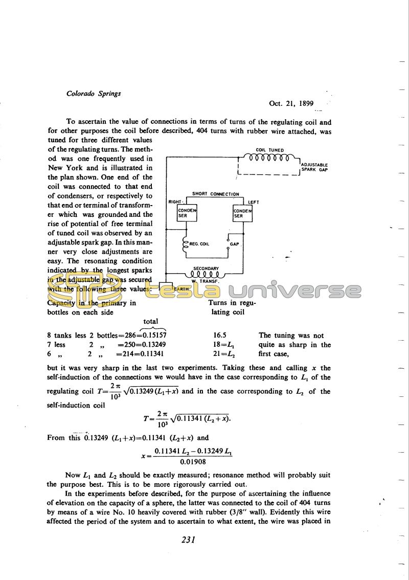 He studied all details of the measurement apparatus very carefully and Tesla did not neglect to calculate the parasitic inductances in the connections. On Oct. 21 he describes the interesting method (which he claims he frequently applied in the New York laboratory) by means of which the parasitic inductance is determined of the circuit element connections. By variation of inductance and capacitance in the oscillator primary at constant oscillator frequency, (which is determined by means of auxiliary circuits) it could be written: Cp1(Lp1 + Lcon.) = Cp2(Lp2 + Lcon.), where Cp1, Lp1 are the first pair and Cp2, Lp2 are the second pair of capacitances and inductances (of the coils) in the primary circuit.