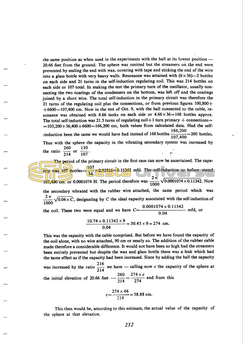 the same position as when used in the experiments with the ball at its lowest position - 20.66 feet from the ground. The sphere was omitted but the streamers on the end were prevented by sealing the end with wax, covering with tape and sticking the end of the wire into a glass bottle with very heavy walls. Resonance was attained with (6 x 36) - 2 bottles on each side and 21 turns in the self-induction regulating coil. This was 214 bottles on each side or 107 total. In making the test the primary turn of the oscillator, usually connecting the two coatings of the condensers on the bottom, was left off and the coatings joined by a short wire. The total self-induction in the primary circuit was therefore the 21 turns of the regulating coil plus the connections, or from previous figures 100, 800 + 6600 = 107,400 cm. Now in the test of Oct. 9, with the ball connected to the cable, resonance was obtained with 4.66 tanks on each side or 4.66 x 36 = 168 bottles approx. The total self-induction was 21.5 turns of regulating coil + 1 turn primary + connections = 103,200 + 56,400 + 6600 = 166,200 cm, both values from calculated data. Had the self-induction been the same we would have had instead of 168 bottles !$ {{166,200 \over 107,400} = 260} !$ bottles. Thus with the sphere the capacity in the the vibrating secondary system was increased by the ratio !$ {260 \over 214} !$ or !$ {130 \over 107} !$.