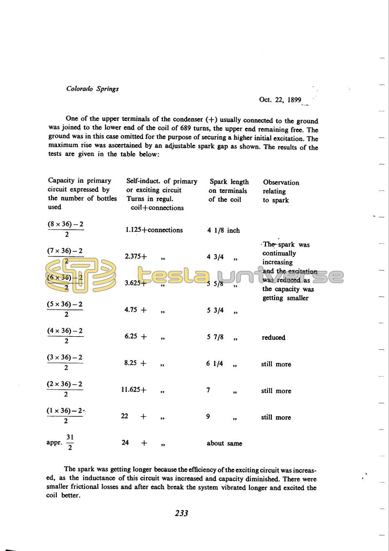 He applies the same measurement method as on the previous day and finds a number of values for the primary inductance and capacitance (for the purpose of determination of the inductance of the connections). The oscillator's frequency is determined on the basis of a maximum spark at the coil's terminals with 689 turns (please see the figure).