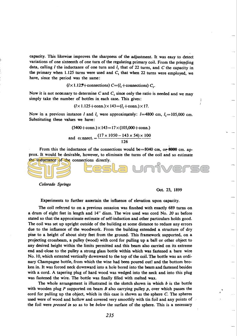 The coil referred to on a previous occasion was finished with exactly 689 turns on a drum of eight feet in length and 14" diam. The wire used was cord No. 20 as before stated so that the approximate estimate of self-induction and other particulars holds good. The coil was set up upright outside of the building at some distance to reduce any errors due to the influence of the woodwork. From the building extended a structure of dry pine to a height of about sixty feet from the ground. This framework supported, on a projecting crossbeam, a pulley (wood) with cord for pulling up a ball or other object to any desired height within the limits permitted and this beam also carried on its extreme end and-close to the pulley a strong glass bottle within which was fastened a bare wire No. 10, which extended vertically downward to the top of the coil. The bottle was an ordinary Champagne bottle, from which the wine had been poured out! and the bottom broken in. It was forced neck downward into a hole bored into the beam and fastened besides with a cord. A tapering plug of hard wood was wedged into the neck and into this plug was fastened the wire. The bottle was finally filled with melted wax.