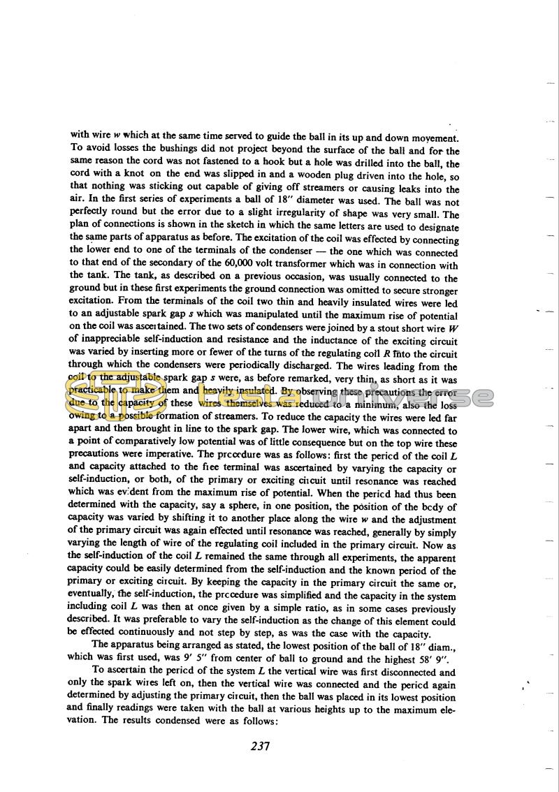with wire w which at the same time served to guide the ball in its up and down movement. To avoid losses the bushings did not project beyond the surface of the ball and for the same reason the cord was not fastened to a hook but a hole was drilled into the ball, the cord with a knot on the end was slipped in and a wooden plug driven into the hole, so that nothing was sticking out capable of giving off streamers or causing leaks into the air. In the first series of experiments a ball of 18" diameter was used. The ball was not perfectly round but the error due to a slight irregularity of shape was very small. The plan of connections is shown in the sketch in which the same letters are used to designate the same parts of apparatus as before. The excitation of the coil was effected by connecting the lower end to one of the terminals of the condenser - the one which was connected to that end of the secondary of the 60,000 volt transformer which was in connection with the tank. The tank, as described on a previous occasion, was usually connected to the ground but in these first experiments the ground connection was omitted to secure stronger excitation. From the terminals of the coil two thin and heavily insulated wires were led to an adjustable spark gap s which was manipulated until the maximum rise of potential on the coil was ascertained. The two sets of condensers were joined by a stout short wire W of inappreciable self-induction and resistance and the inductance of the exciting circuit was varied by inserting more or fewer of the turns of the regulating coil R into the circuit through which the condensers were periodically discharged. The wires leading from the coil to the adjustable spark gap s were, as before remarked, very thin, as short as it was practicable to make them and heavily insulated. By observing these precautions the error due to the capacity of these wires themselves was reduced to a minimum, also the loss owing to a possible formation of streamers. To reduce the capacity the wires were led far apart and then brought in line to the spark gap. The lower wire, which was connected to a point of comparatively low potential was of little consequence but on the top wire these precautions were imperative. The procedure was as follows: first the period of the coil L and capacity attached to the free terminal was ascertained by varying the capacity or self-induction, or both, of the primary or exciting circuit until resonance was reached which was evident from the maximum rise of potential. When the period had thus been determined with the capacity, say a sphere, in one position, the position of the body of capacity was varied by shifting it to another place along the wire w and the adjustment of the primary circuit was again effected until resonance was reached, generally by simply varying the length of wire of the regulating coil included in the primary circuit. Now as the self-induction of the coil L remained the same through all experiments, the apparent capacity could be easily determined from the self-induction and the known period of the primary or exciting circuit. By keeping the capacity in the primary circuit the same or, eventually, the self-induction, the procedure was simplified and the capacity in the system including coil L was then at once given by a simple ratio, as in some cases previously described. It was preferable to vary the self-induction as the change of this element could be effected continuously and not step by step, as was the case with the capacity.