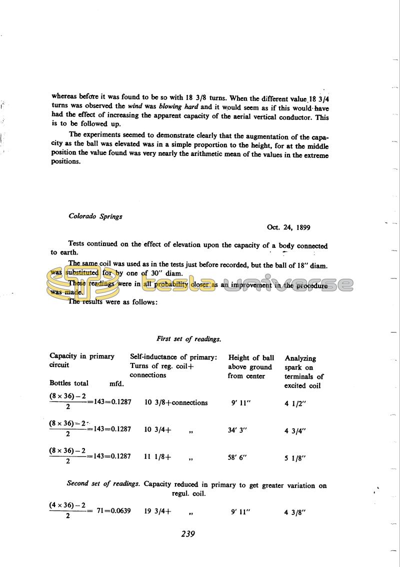 Tesla performed a number of measurements for the purpose of checking first one then a second value of the capacitance in the primary circuit but he did not perform any calculations.