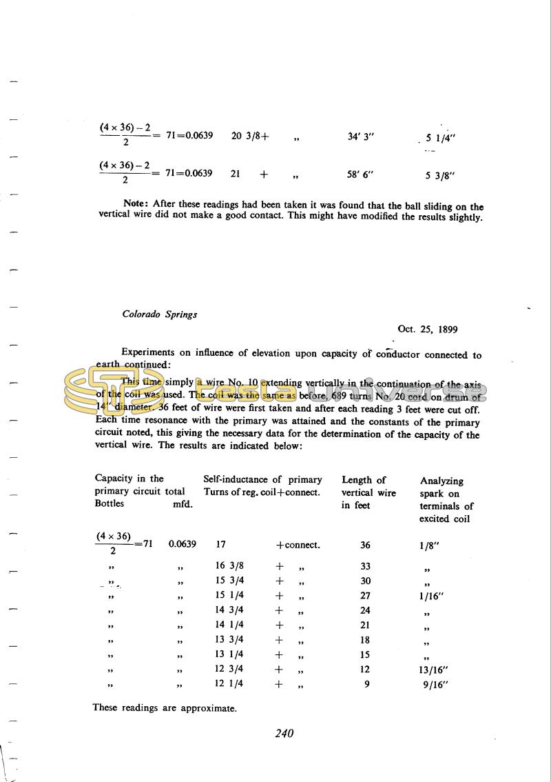 He measures the thin wire capacitance which is vertically positioned above the resonant coil for measurements (please see figures given on October 23). The method is the same as on the previous days. He gives the measurement data in tabular form but again he does not perform the calculation.
