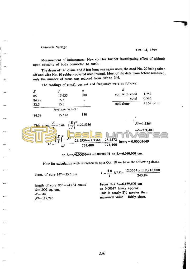 L = !$ {4 \pi \over l} !$ N2 S = !$ {{12.5664 \times 119,716,000} \over 243.84} !$ From this L = 6,169,600 cm or 0.00617 henry approx. This is nearly 2% greater than measured value - fairly close. |