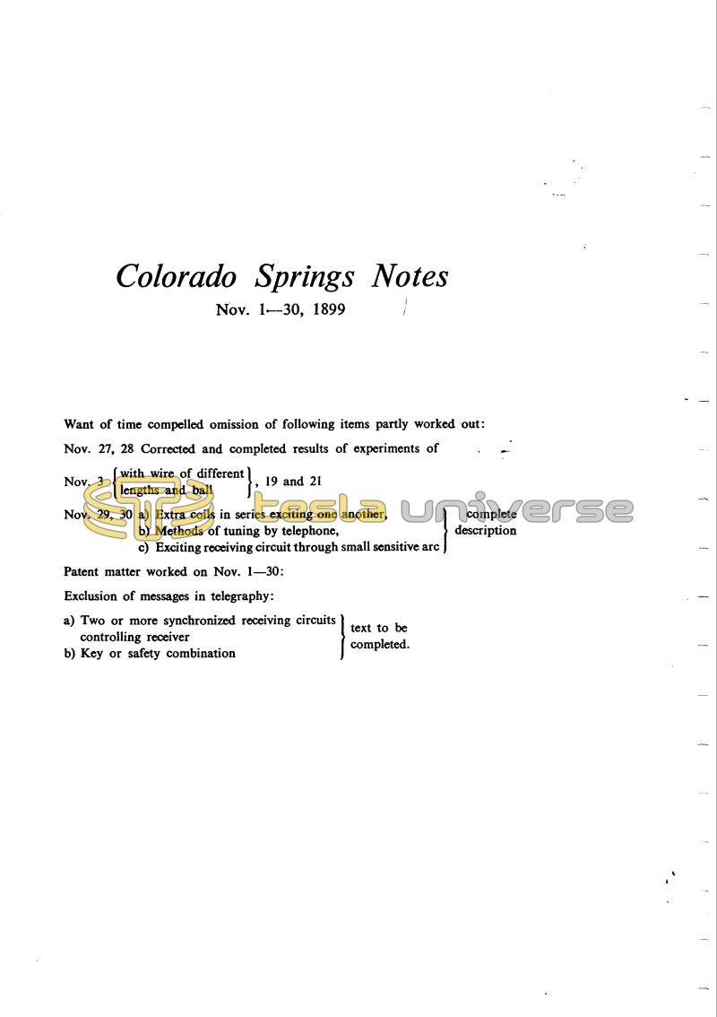 | Nov. 29, 30 | a) Extra coils in series exciting one another, b) Methods of tuning by telephone, c) Exciting receiving circuit through small sensitive arc |