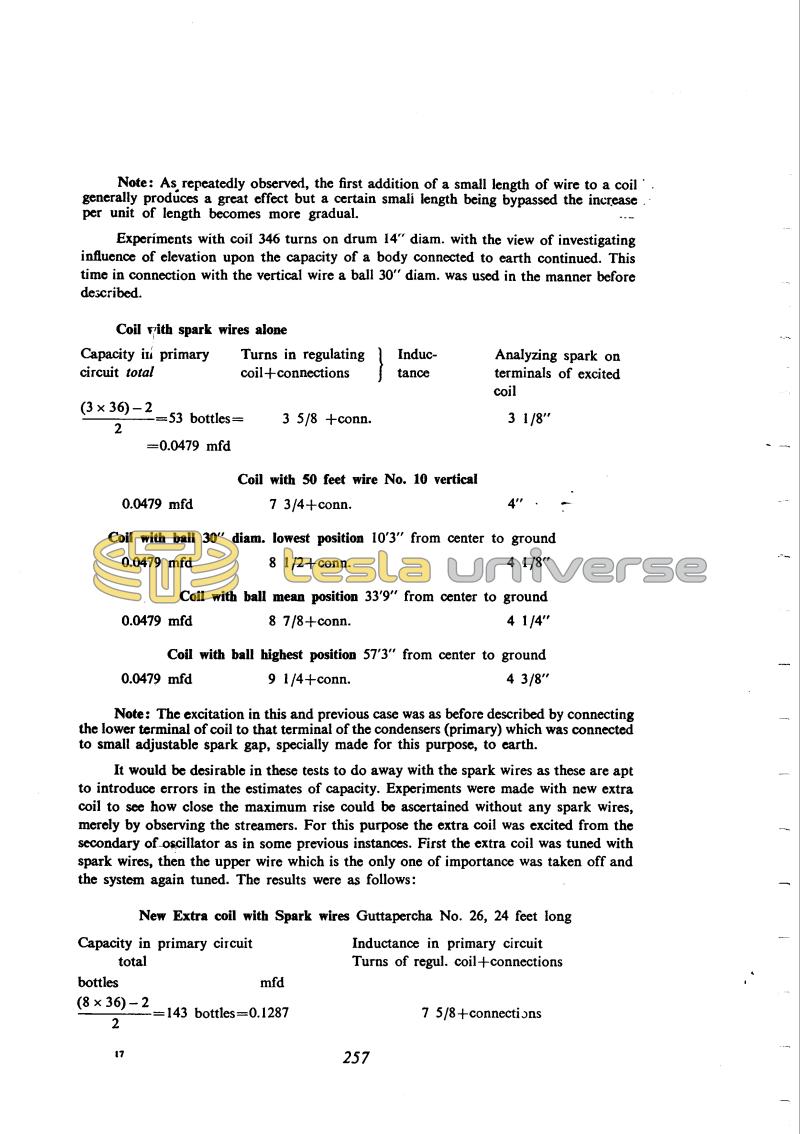 He measures the capacitance of the vertical wire and sphere of 30" in diameter again by following the method of Oct. 29 but with new coil L (please see Oct. 31). that he attempts to eliminate the wires of the measuring arc gap and that for pose of finding the resonance he uses the current streamers indication.