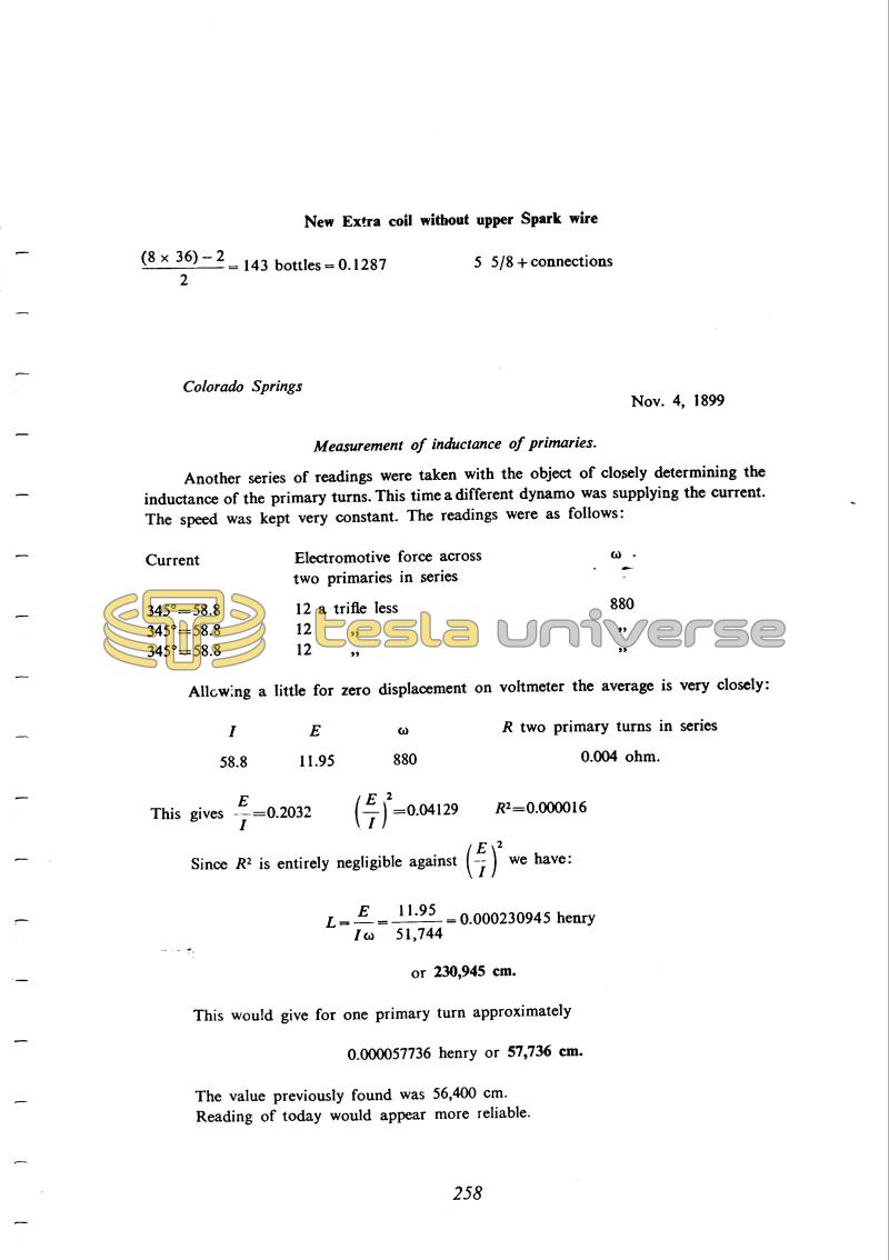 He measures the oscillator primary inductance again with a new supply source. The obtained result he compares with the previous one, probably with the one of Sept. 25. He draws the conclusion that new result is more reliable. On photographs of Tesla's laboratory in Colorado Springs the pole which is in the middle of the laboratory could always be seen. The geometrical dimensions of this pole are given in the notes of Oct. 17. On Nov. 5 he calculates the capacitance of the sum mid pole sections. He considers that the total capacitance is the sum of the capacitances of the individual portions of various diameters of the pole. When calculating he applies the equation given the first time on Oct. 28. Finally at the end of the calculation he gives an interesting comment which illustrates how deeply he got into the physical essence of the event.