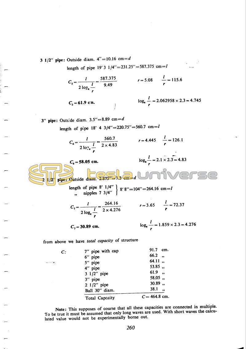 Photographs of the Colorado Springs laboratory always show the pole rising from the center of the building. Its dimensions are given in the entry of 17 October. Now Tesla calculates the capacity of the pole as the sum of the capacities of its parts of different thickness, using the formula first cited on October 28th. His final remark indicates that he had thoroughly understood the physical essence of the phenomenon.