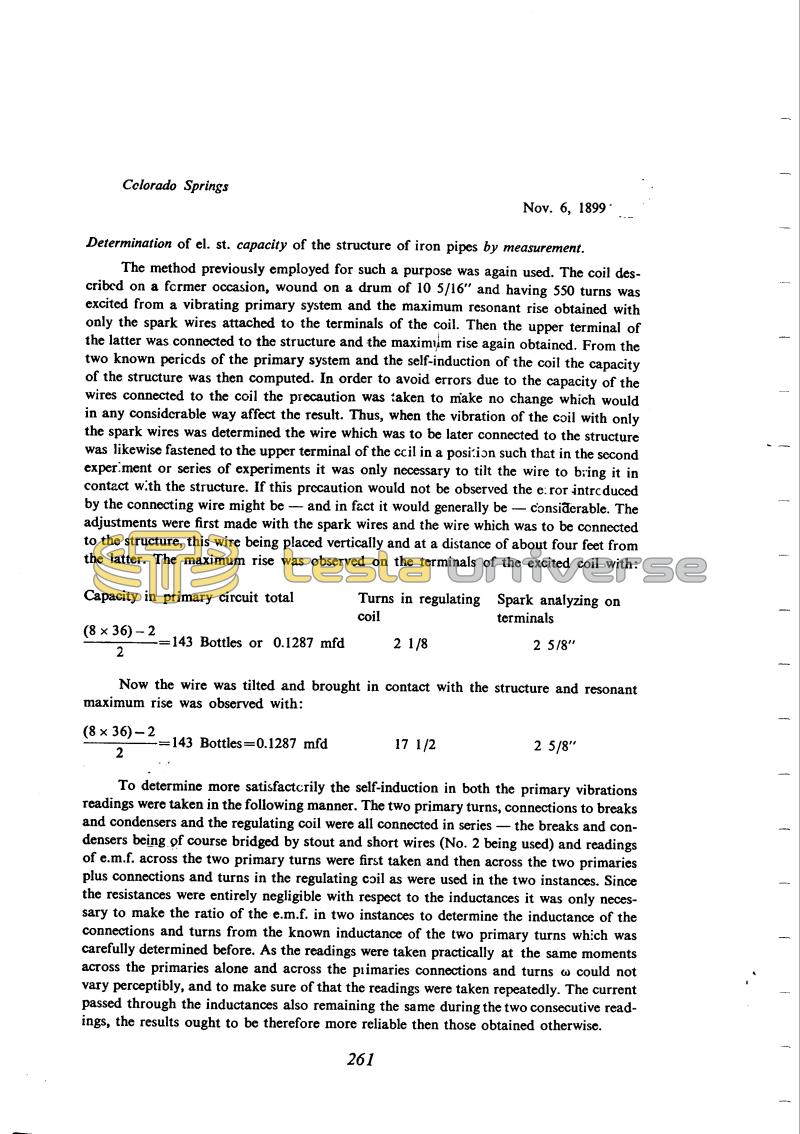 Tesla carefully measured the capacitance of the aerial pole by the resonance method, from the known inductance of the 550-turn coil (see September 8th) and known frequency of the oscillator, with two measurements, one with and the other without the capacity to be measured. He did not make use of his earlier results for the inductance of the regulating coil and connections from October 30th, although he could have done. A calculation check shows that the results of October 30th were rather high (by as much as 10% for 2 1/8 turns of the regulating coil), but Tesla probably thought that the new procedure was better and so did not use the old results. An analysis shows that if the old values had been used the final result would not have been essentially affected, so that Tesla's conclusion that the measured capacity of the pole was less than the theoretical value of November 5th remains valid.