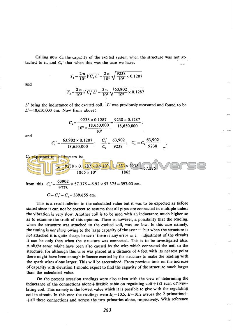 This is a result inferior to the calculated value but it was to be expected as before stated since it can not be correct to assume that all pipes are connected in multiple unless the vibration is very slow. Another coil is to be used with an inductance much higher so as to examine the truth of this opinion. There is, however, a possibility that the reading, when the structure was attached to the excited coil, was too low. In this case namely, the tuning is not sharp owing to the large capacity of the system but when the structure is not attached it is quite sharp, hence it there is any error in the adjustment of the circuits it can be only then when the structure was connected. This is to be investigated also. A slight error might have been also caused by the wire which connected the coil to the structure, for although this wire was placed at a distance of 4 feet with its nearest point there might have been enough influence exerted by the structure to make the reading with the spark wires alone larger. This will be ascertained. From previous tests on the increase of capacity with elevation I should expect to find the capacity of the structure much larger than the calculated value.
