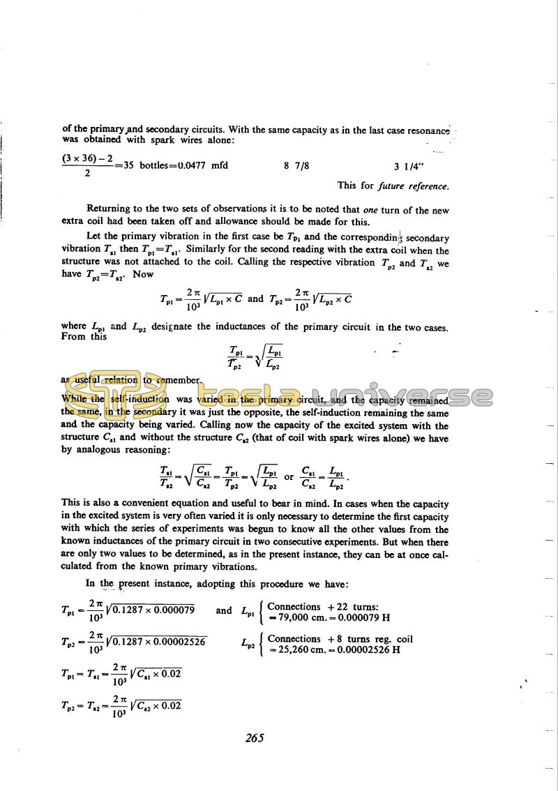 This is also a convenient equation and useful to bear in mind. In cases when the capacity in the excited system is very often varied it is only necessary to determine the first capacity with which the series of experiments was begun to know all the other values from the known inductances of the primary circuit in two consecutive experiments. But when there are only two values to be determined, as in the present instance, they can be at once calculated from the known primary vibrations.