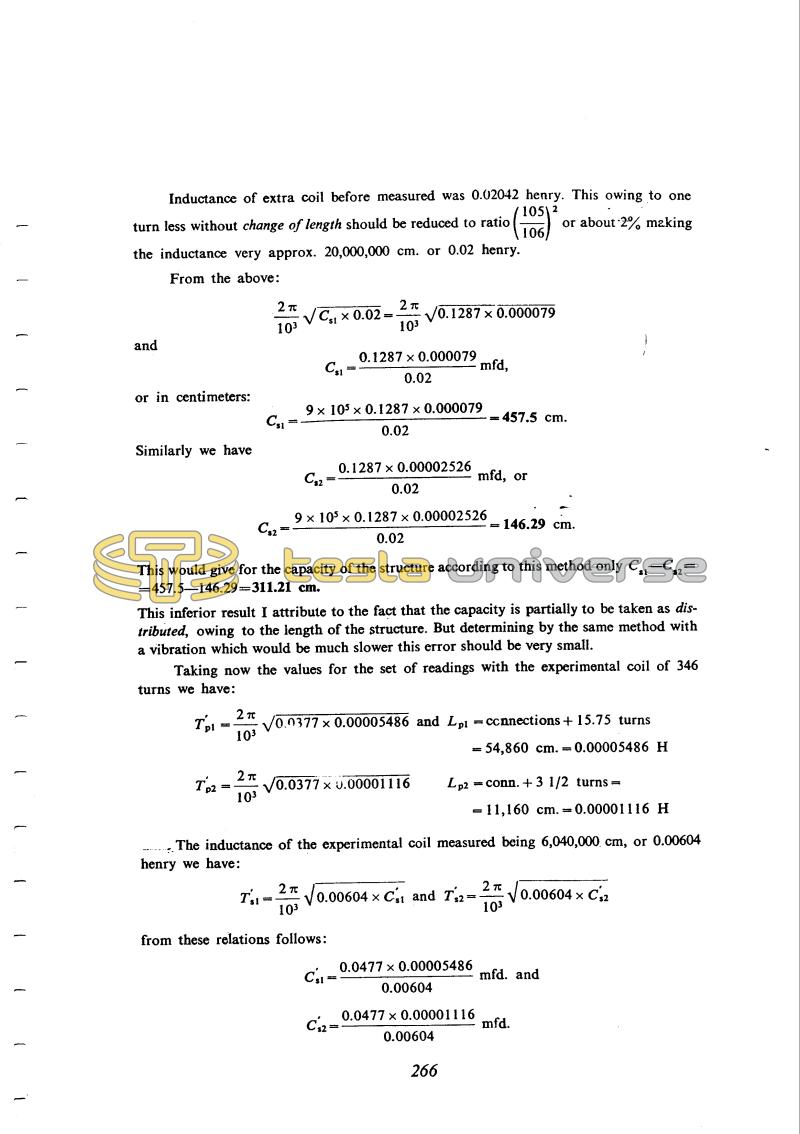 Measurement of the capacity of the structure at two frequencies was intended to demonstrate the reduction of effective capacity with increasing frequency. Tesla did in fact obtain a small difference, but it is dubious proof considering the accuracy of the measurements. The frequency difference was quite large, from 50 kHz to nearly 250 kHz (using "extra" and "experimental" coils).