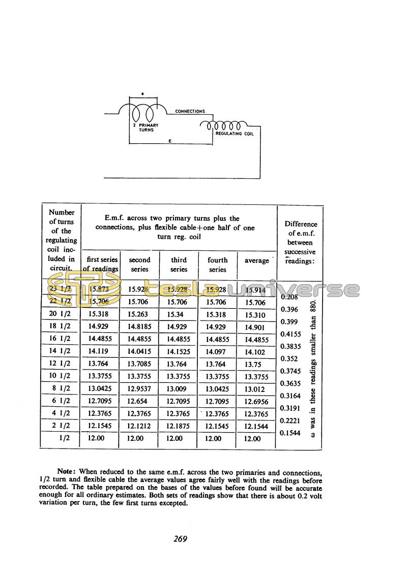 Note: When reduced to the same e.m.f. across the two primaries and connections, 1/2 turn and flexible cable the average values agree fairly well with the readings before recorded. The table prepared on the bases of the values before found will be accurate enough for all ordinary estimates. Both sets of readings show that there is about 0.2 volt variation per turn, the few first turns excepted.