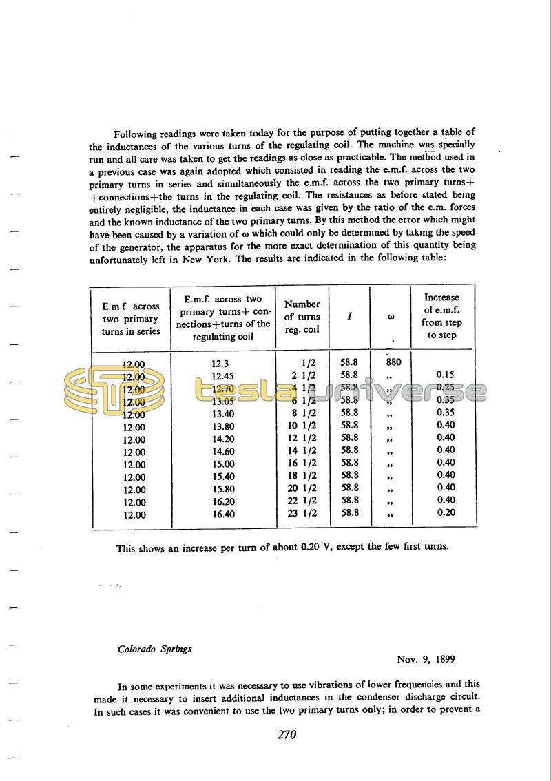 Following readings were taken today for the purpose of putting together a table of the inductances of the various turns of the regulating coil. The machine was specially run and all care was taken to get the readings as close as practicable. The method used in a previous case was again adopted which consisted in reading the e.m.f. across the two primary turns in series and simultaneously the e.m.f. across the two primary turns + connections + the turns in the regulating coil. The resistances as before stated being entirely negligible, the inductance in each case was given by the ratio of the e.m. forces and the known inductance of the two primary turns. By this method the error which might have been caused by a variation of Ï which could only be determined by taking the speed of the generator, the apparatus for the more exact determination of this quantity being unfortunately left in New York. The results are indicated in the following table: