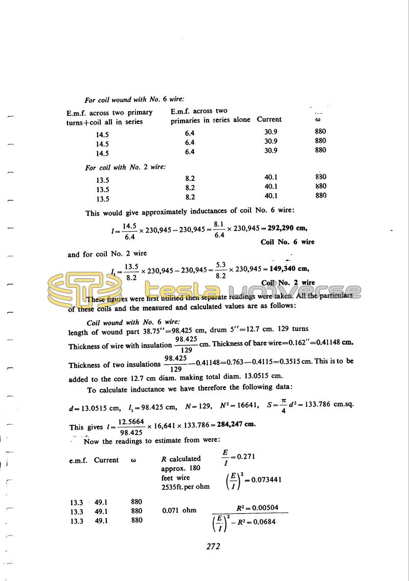 He performs the interesting measurements of the mutual inductance on the basis of the primary inductance when the secondary is open, and in short circuit. He measured inductances at constant current and frequency so the calculation procedure is simplified. The obtained mutual inductance he compared with the inductance determined previously by means of induced voltage under no load conditions. Tesla thinks that the difference originates from the influence of the secondary on the primary when the secondary is open. In some cases for the purpose of oscillator operating frequency reduction Tesla used two separate coils which he did not name but designated by numbers. He compared the calculated and measured values for these coils. The measured value on the basis of voltage the ratio method amounts to approximately 2% less than values measured on the basis of voltage, current and frequency. The calculated values are smaller in both cases. The correction of measured values according to comment of Oct. 26 is not large (approximately 5%) because the ratio D/1 is relatively small.