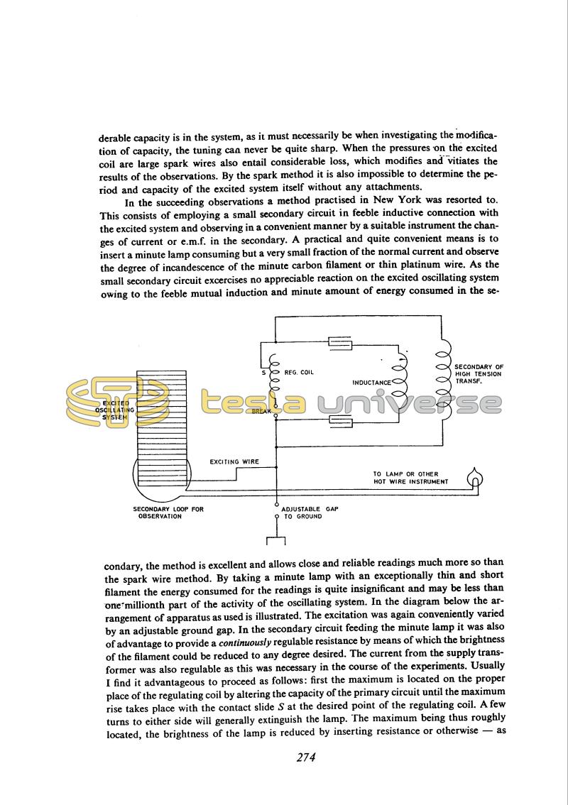 In the succeeding observations a method practised in New York was resorted to. This consists of employing a small secondary circuit in feeble inductive connection with the excited system and observing in a convenient manner by a suitable instrument the changes of current or e.m.f. in the secondary. A practical and quite convenient means is to insert a minute lamp consuming but a very small fraction of the normal current and observe the degree of incandescence of the minute carbon filament or thin platinum wire. As the small secondary circuit exercises no appreciable reaction on the excited oscillating system owing to the feeble mutual induction and minute amount of energy consumed in the secondary, the method is excellent and allows close and reliable readings much more so than the spark wire method.