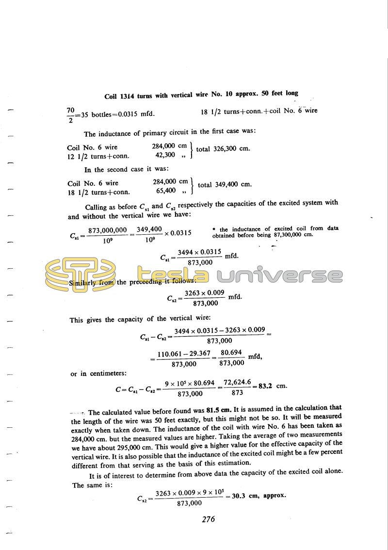 By using the newly applied method of resonance indication he performs some measurements again and he measures the capacitance of a vertical wire 50 ft. in length. After this he switches over to determine the coil self-capacitance with 1314 turns. The measured result he compared with the calculated one for the capacitance of a metal cylinder of the same shape as the coil. According to Tesla, this serves only as a rough estimate. When they are using the entire coil length in the first calculation, he obtained a higher value than measured, he takes the effective coil length on the basis of bare wire. It is obvious that Tesla looks for orientation of the theoretical equations in order to be able to estimate parameters, but the experiment is the most effective factor. As far as the problem of determining the coil self capacitance, this is evident from the first days of the notes (please see eg. June 20, July 3, etc.)