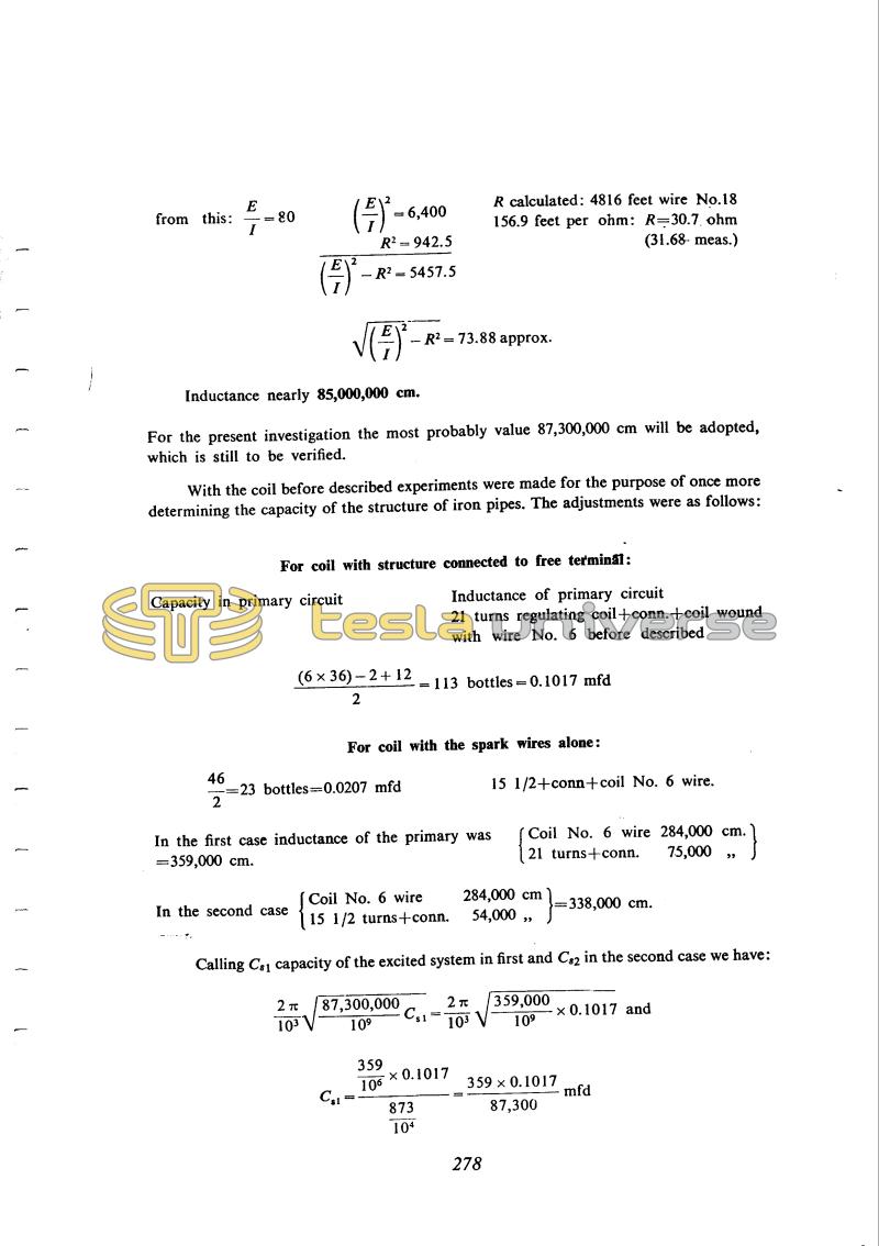 By using the newly applied method of resonance indication he performs some measurements again and he measures the capacitance of a vertical wire 50 ft. in length. After this he switches over to determine the coil self-capacitance with 1314 turns. The measured result he compared with the calculated one for the capacitance of a metal cylinder of the same shape as the coil. According to Tesla, this serves only as a rough estimate. When they are using the entire coil length in the first calculation, he obtained a higher value than measured, he takes the effective coil length on the basis of bare wire. It is obvious that Tesla looks for orientation of the theoretical equations in order to be able to estimate parameters, but the experiment is the most effective factor. As far as the problem of determining the coil self capacitance, this is evident from the first days of the notes (please see eg. June 20, July 3, etc.)