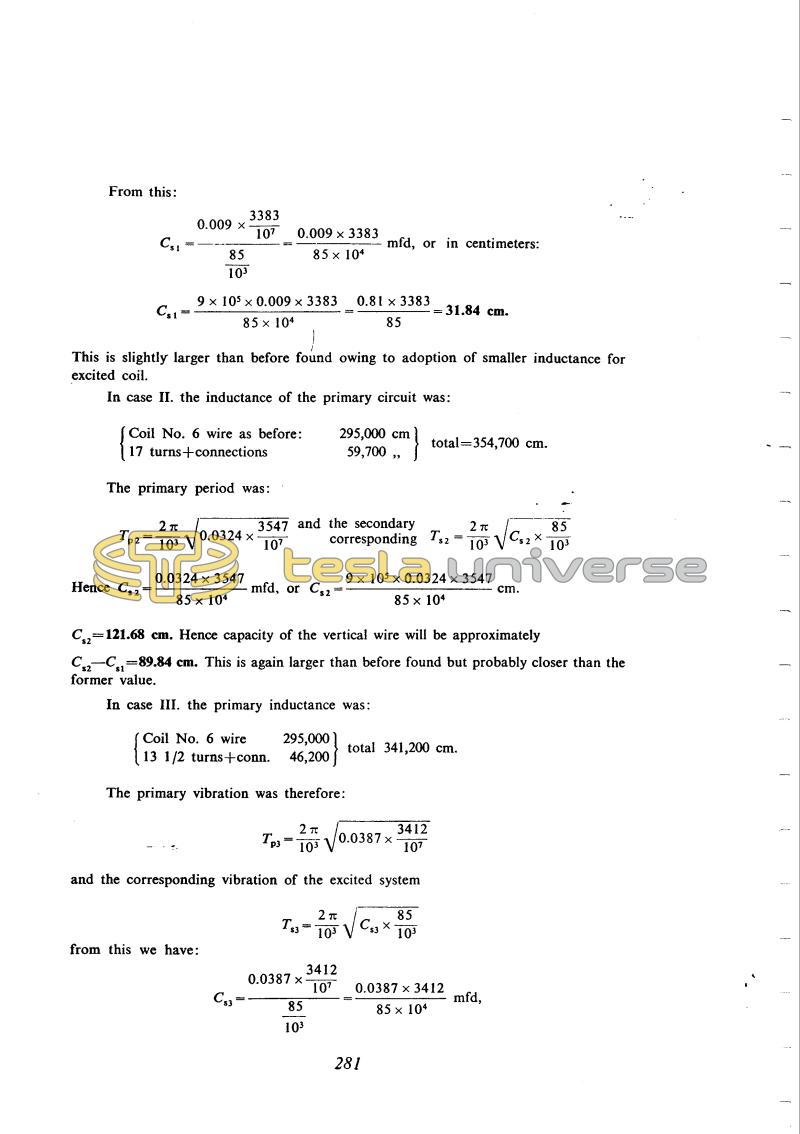 Hence Cs2 = !$ {{0.0324 \times 3547} \over {85 \times 10^{4}}} !$ mfd, or Cs2 = !$ {{9 \times 10^{5} \times 0.0324 \times 3547} \over {85 \times 10^{4}}} !$ cm.
