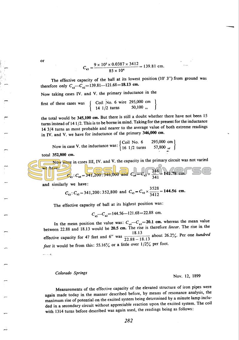 Measurements of the effective capacity of the elevated structure of iron pipes were again made today in the manner described before, by means of resonance analysis, the maximum rise of potential on the excited system being determined by a minute lamp included in a secondary circuit without appreciable reaction upon the excited system. The coil with 1314 turns before described was again used, the readings being as follows: