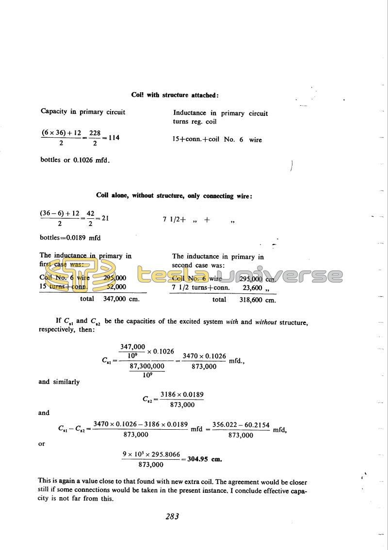 Measurements of the pole capacity, like those of November 7th, but now using a coil with 1314 turns. Resonance was determined by means of a small lamp in series with a coil loosely coupled to the measuring circuit. The value obtained was again similar, so Tesla concludes that it is near the true value of the effective capacity.