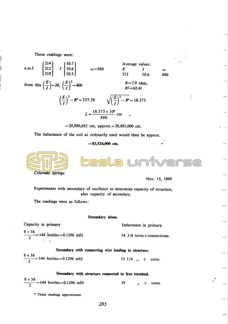 Tesla again measures the capacity of the sphere on top of the metal pole as on November 7th and 12th, but with the secondary coil of the oscillator instead of the earlier "supplementary" coils. The results did not agree with those obtained earlier. Tesla puts this down to the large distributed capacity of this coil, but it would seem that other factors influenced the accuracy as well. Because of the tight coupling between the primary and secondary of the oscillator, it was probably producing a compound spectrum.