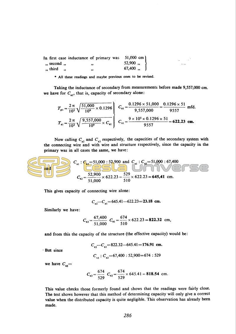 Taking the inductance of secondary from measurements before made 9,557,000 cm. we have for Cs1, that is, capacity of secondary alone: