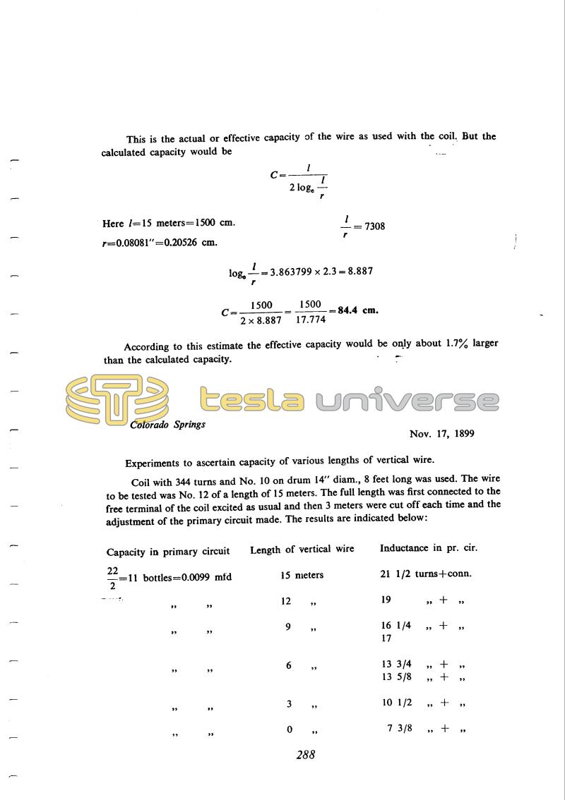 On November 17th and 19th he measured the capacity of a vertical wire of various lengths and gauges. From his comments on November 17th it may be seen that at greater lengths he expected some inductive effect. A check of the wavelength, however, reveals that all Tesla's antennas were short in comparison (h/λ of the order of 0.01), so that divergence between the theoretical and measured values cannot be ascribed to an inductive effect.