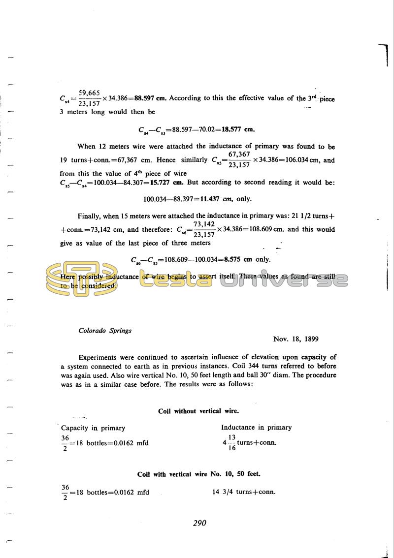 Finally, when 15 meters were attached the inductance in primary was: 21 1/2 turns + conn. = 73,142 cm, and therefore: Cs6 = !$ {73,142 \over 23,157} !$ x 34.386 = 108.609 cm. and this would give as value of the last piece of three meters