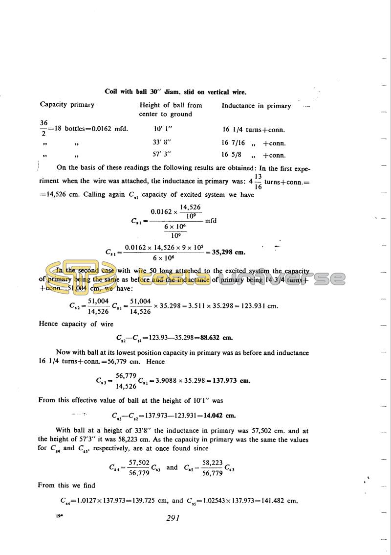 On the basis of these readings the following results are obtained: In the first experiment when the wire was attached, the inductance in primary was: 4 !$ {13 \over 16} !$ turns + conn. = 14,526 cm. Calling again Cs1 capacity of excited system we have