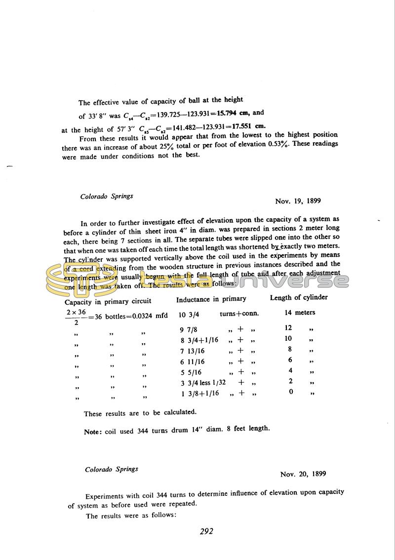In order to further investigate effect of elevation upon the capacity of a system as before a cylinder of thin sheet iron 4" in diam. was prepared in sections 2 meter long each, there being 7 sections in all. The separate tubes were slipped one into the other so that when one was taken off each time the total length was shortened by exactly two meters. The cylinder was supported vertically above the coil used in the experiments by means of a cord extending from the wooden structure in previous instances described and the experiments were usually begun with the full length of tube and after each adjustment one length was taken off. The results were as follows: