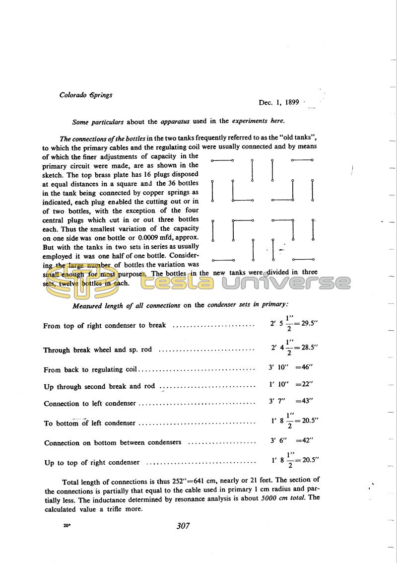 Total length of connections is thus 252" = 641 cm, nearly or 21 feet. The section of the connections is partially that equal to the cable used in primary 1 cm radius and partially less. The inductance determined by resonance analysis is about 5000 cm total. The calculated value a trifle more.