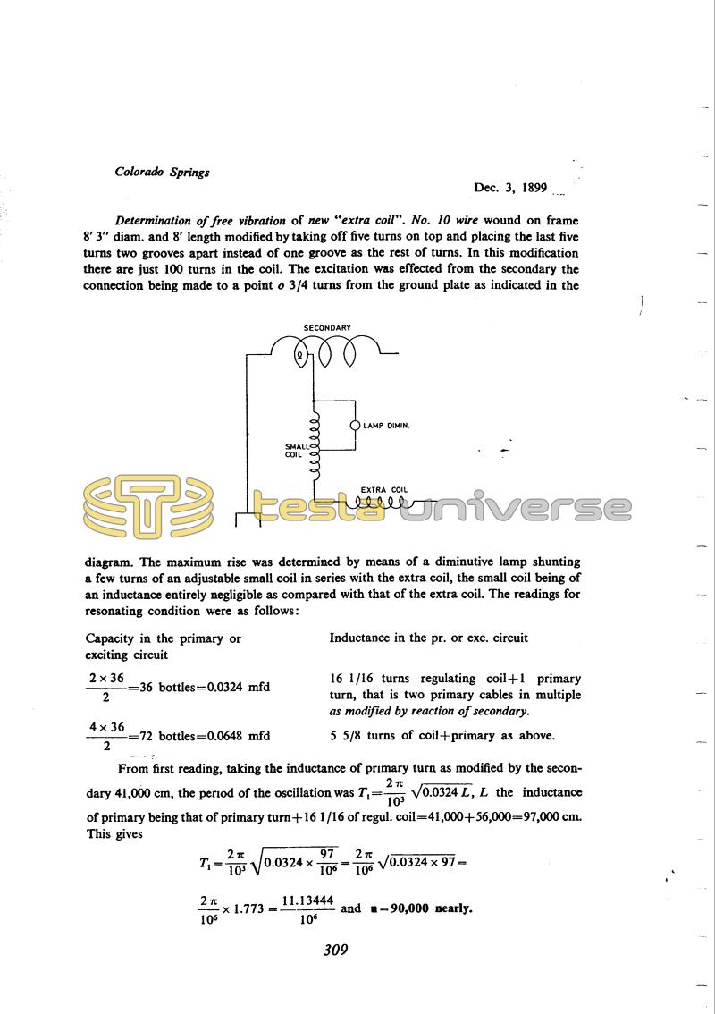 He returns to experiment with the oscillator and "additional coil". The resonant frequency he calculates as above earlier by a simplified procedure. In the measurement performed on December 4 he excluded the "additional coil". He measured the frequency by means of the resonant coil (i.e., coil which becomes resonant with its distributed capacitance). By means of interchange methods he determines "reduced" primary inductance.