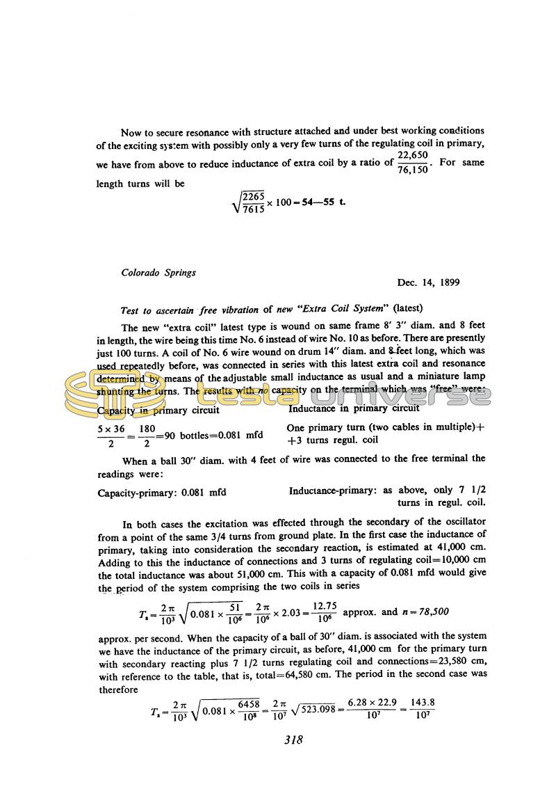 He tests a new "additional coil by using previously described resonant methods (please see Dec. 3). He includes in the oscillator circuit the resonant transformer, and the "additional" coil excites via secondary terminals. The estimate of operating frequency he obtains by calculation on the basis of ''reduced primary inductance'' and capacitance in the primary circuit. On the basis of undefined "reduction of primary inductance" (please see the remark along with the comment on Dec. 5), all results are, as Tesla himself says, rough approximations of accurate results.