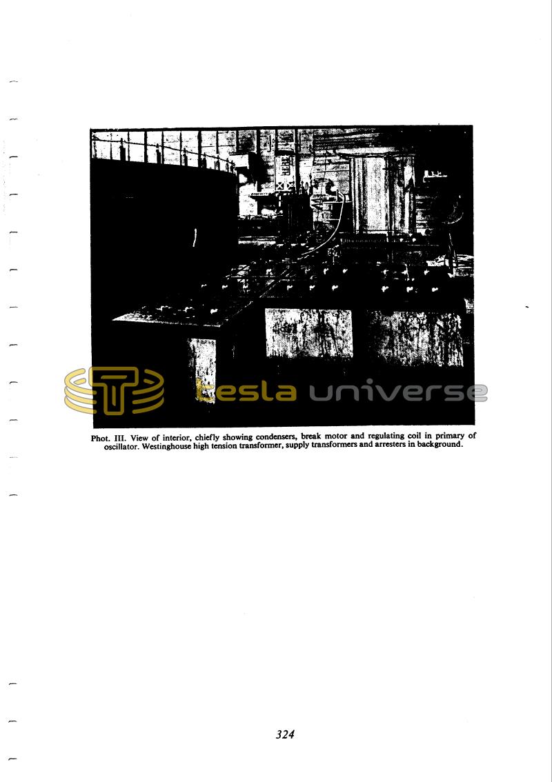Phot. III. View of interior, chiefly showing condensers, break motor and regulating coil in primary of oscillator. Westinghouse high tension transformer, supply transformers and arresters in background.