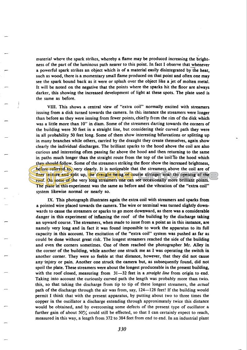 IX. This photograph illustrates again the extra coil with streamers and sparks from a pointed wire placed towards the camera. The wire or terminal was turned slightly downwards to cause the streamers or sparks to go more downward, as there was a considerable danger in this experiment of inflaming the roof of the building by the discharge taking an upward course. The streamers, when made to issue from a point as in this instance, are namely very long and in fact it was found impossible to work the apparatus to its full capacity in this account. The excitation of the "extra coil" system was pushed as far as could be done without great risk. The longest streamers reached the side of the building and even the corners sometimes. One of them reached the photographer Mr. Alley in the corner of the building, while another one struck me as I was operating the switch in another corner. They were so feeble at that distance, however, that they did not cause any injury or pain. Another one struck the camera but, as subsequently found, did not spoil the plate. These streamers were about the longest produceable in the present building, with the roof closed, measuring from 31 - 32 feet in a straight line from origin to end. Taking into account the curiously curved path the length was probably more than twice this, so that taking the discharge from tip to tip of these longest streamers, the actual path of the discharge through the air was from, say, 124 - 128 feet! If the building would permit I think that with the present apparatus, by putting about two to three times the copper in the oscillator a discharge extending through approximately twice this distance would be obtained, and by overcoming some defects of the present type of oscillator a further gain of about 50% could still be effected, so that I can certainly expect to reach, measured in this way, a length from 372 to 384 feet from end to end. In an industrial plant