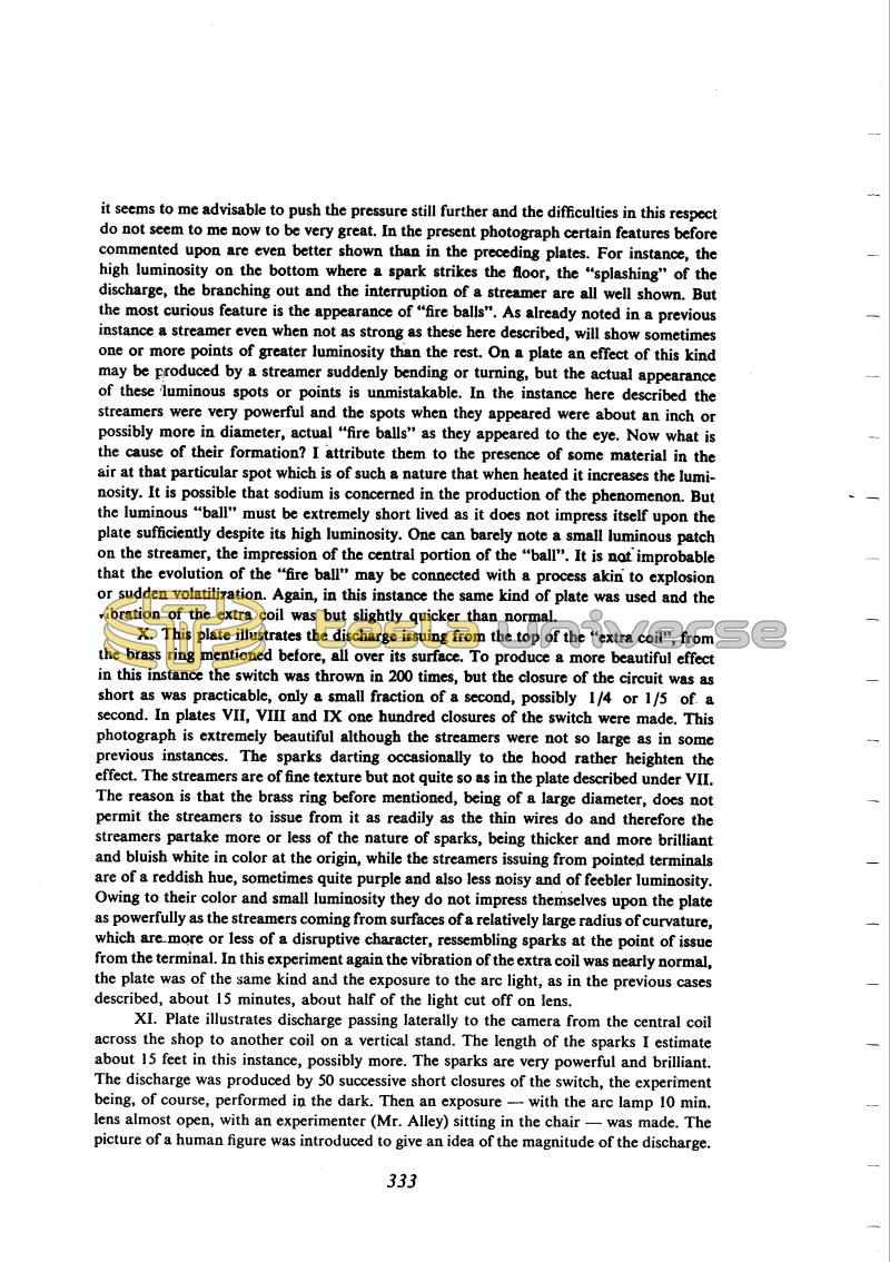X. This plate illustrates the discharge issuing from the top of the "extra coil", from the brass ring mentioned before, all over its surface. To produce a more beautiful effect in this instance the switch was thrown in 200 times, but the closure of the circuit was as short as was practicable, only a small fraction of a second, possibly 1/4 or 1/5 of a second. In plates VII, VIII and IX one hundred closures of the switch were made. This photograph is extremely beautiful although the streamers were not so large as in some previous instances. The sparks darting occasionally to the hood rather heighten the effect. The streamers are of fine texture but not quite so as in the plate described under VII. The reason is that the brass ring before mentioned, being of a large diameter, does not permit the streamers to issue from it as readily as the thin wires do and therefore the streamers partake more or less of the nature of sparks, being thicker and more brilliant and bluish white in color at the origin, while the streamers issuing from pointed terminals are of a reddish hue, sometimes quite purple and also less noisy and of feebler luminosity. Owing to their color and small luminosity they do not impress themselves upon the plate as powerfully as the streamers coming from surfaces of a relatively large radius of curvature, which are more or less of a disruptive character, ressembling sparks at the point of issue from the terminal. In this experiment again the vibration of the extra coil was nearly normal, the plate was of the same kind and the exposure to the arc light, as in the previous cases described, about 15 minutes, about half of the light cut off on lens.