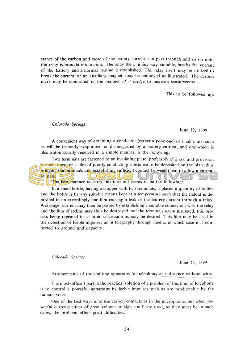 From the very start of his work on wireless transmission of signals in 1892 - 1893 Tesla advocated the use of continuous HF current, while other experimenters were working with damped impulses. The advantage of continuous currents is particularly great in the transmission of continuous signals, such as speech. The entries for the 13th and 14th of June describe two modifications of the HF oscillator which could be used for amplitude modulation. These two circuits were probably in fact the first modulators in the history of radio. It is not known whether Tesla carried out any experiments with this apparatus, but similar ideas were implemented later(19).