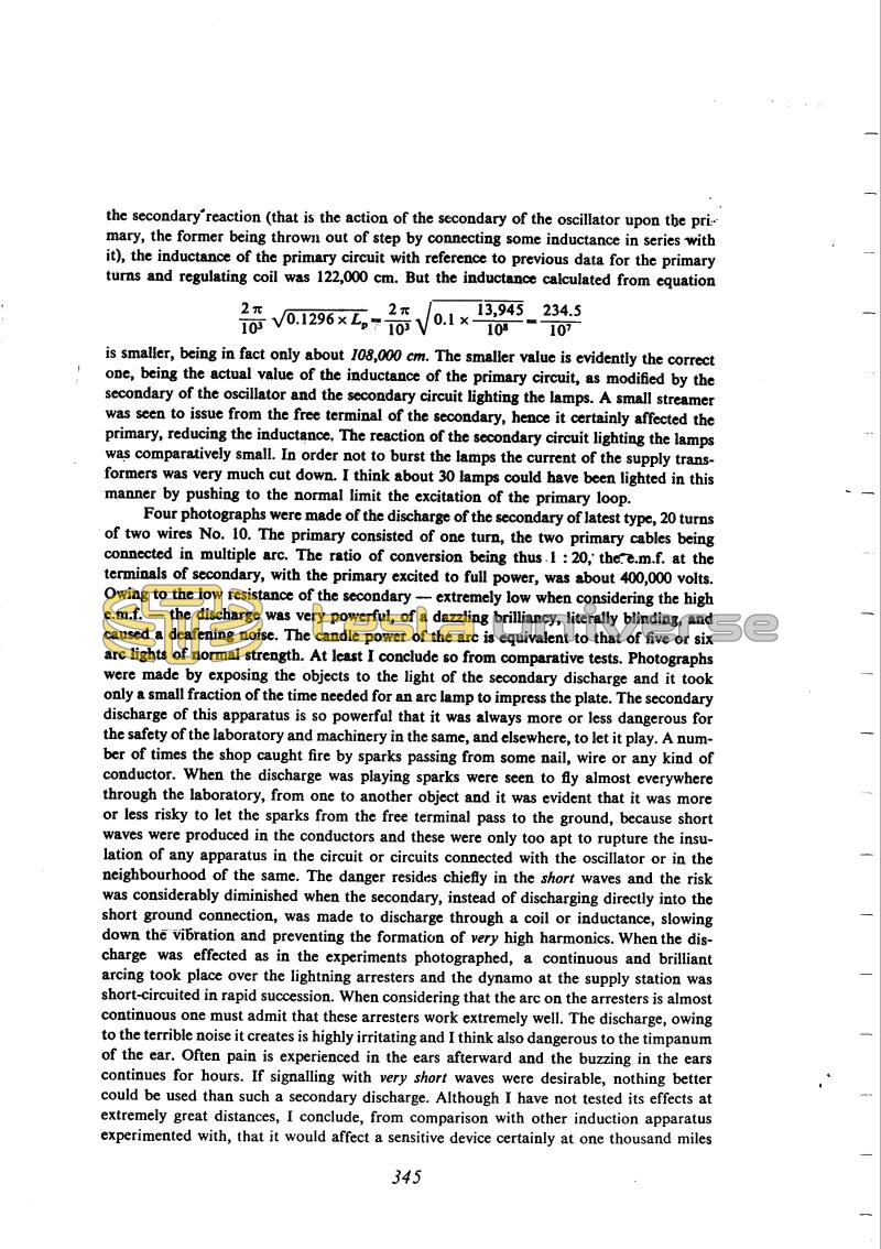 Four photographs were made of the discharge of the secondary of latest type, 20 turns of two wires No. 10. The primary consisted of one turn, the two primary cables being connected in multiple arc. The ratio of conversion being thus 1:20, the e.m.f. at the terminals of secondary, with the primary excited to full power, was about 400,000 volts. Owing to the low resistance of the secondary - extremely low when considering the high e.m.f. - the discharge was very powerful, of a dazzling brilliancy, literally blinding, and caused a deafening noise. The candle power of the arc is equivalent to that of five or six arc lights of normal strength. At least I conclude so from comparative tests. Photographs were made by exposing the objects to the light of the secondary discharge and it took only a small fraction of the time needed for an arc lamp to impress the plate. The secondary discharge of this apparatus is so powerful that it was always more or less dangerous for the safety of the laboratory and machinery in the same, and elsewhere, to let it play. A number of times the shop caught fire by sparks passing from some nail, wire or any kind of conductor. When the discharge was playing sparks were seen to fly almost everywhere through the laboratory, from one to another object and it was evident that it was more or less risky to let the sparks from the free terminal pass to the ground, because short waves were produced in the conductors and these were only too apt to rupture the insulation of any apparatus in the circuit or circuits connected with the oscillator or in the neighbourhood of the same. The danger resides chiefly in the short waves and the risk was considerably diminished when the secondary, instead of discharging directly into the short ground connection, was made to discharge through a coil or inductance, slowing down the vibration and preventing the formation of very high harmonics. When the discharge was effected as in the experiments photographed, a continuous and brilliant arcing took place over the lightning arresters and the dynamo at the supply station was short-circuited in rapid succession. When considering that the arc on the arresters is almost continuous one must admit that these arresters work extremely well. The discharge, owing to the terrible noise it creates is highly irritating and I think also dangerous to the tympanum of the ear. Often pain is experienced in the ears afterward and the buzzing in the ears continues for hours. If signalling with very short waves were desirable, nothing better could be used than such a secondary discharge. Although I have not tested its effects at extremely great distances, I conclude, from comparison with other induction apparatus experimented with, that it would affect a sensitive device certainly at one thousand miles