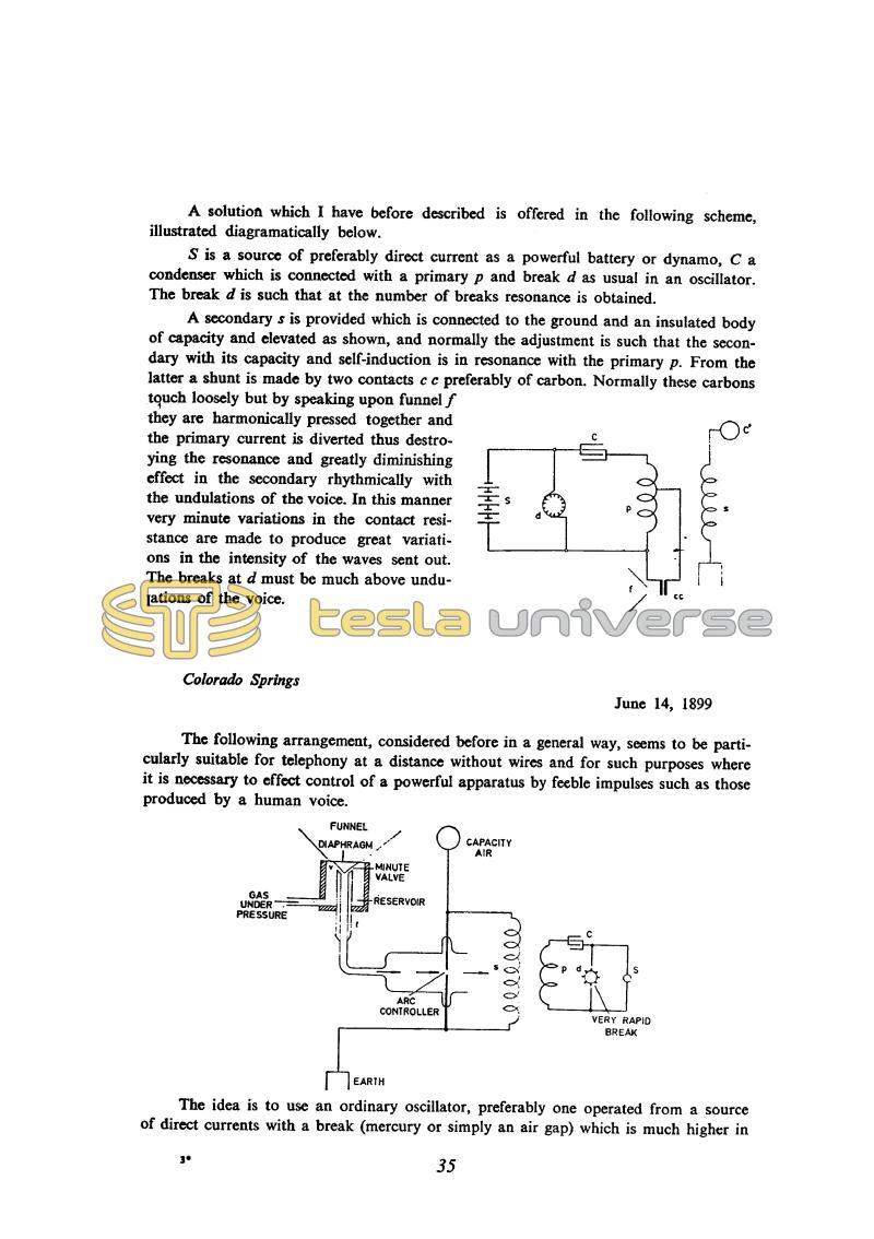 From the very start of his work on wireless transmission of signals in 1892 - 1893 Tesla advocated the use of continuous HF current, while other experimenters were working with damped impulses. The advantage of continuous currents is particularly great in the transmission of continuous signals, such as speech. The entries for the 13th and 14th of June describe two modifications of the HF oscillator which could be used for amplitude modulation. These two circuits were probably in fact the first modulators in the history of radio. It is not known whether Tesla carried out any experiments with this apparatus, but similar ideas were implemented later(19).