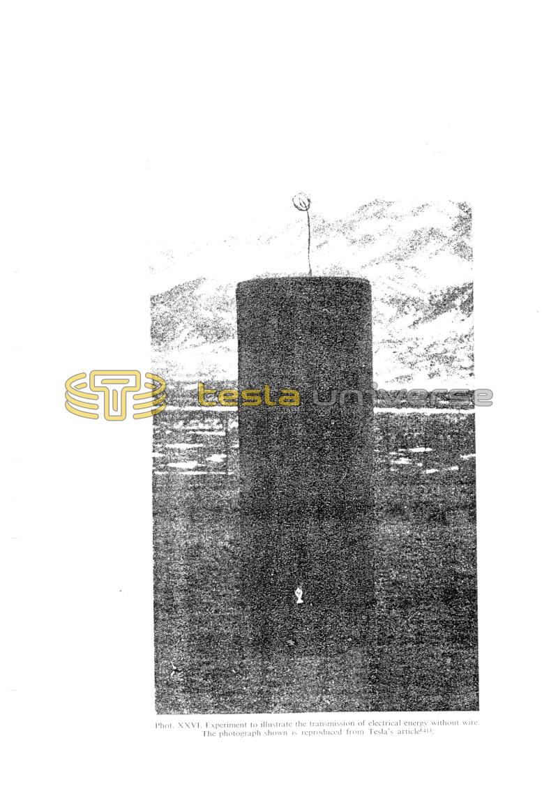The explanation to Photograph XXII concerning the transmission of power from the excited primary circuit to the "extra coil" via the earth is similar to that he gave in 1893(6). The experiment to which the photograph refers was made with the aim of estimating the power of the oscillator from the thermal effect of the HF current. What Tesla calls the "total energy set in movement" would correspond to the total energy transferred to condenser in the secondary (i.e. the power) if an energy of !${1 \over 2}!$ CV2 is transferred in each half-cycle. It can be shown that the active power dissipated in the circuit is much less than this and is inversely proportional to the Q-factor of the oscillating circuit.