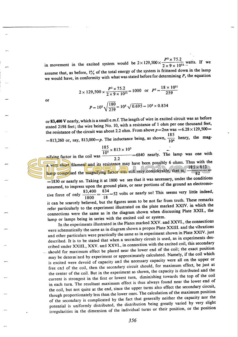 or 83,400 V nearly, which is a small e.m.f. The length of wire in excited circuit was as before stated 2198 feet; the wire being No. 10, with a resistance of 1 ohm per one thousand feet, the resistance of the circuit was about 2.2 ohm. From above p = 2!$ \pi !$n was = 6.28 x 129,500 = 813,260 or, say, 813,000 = p. The inductance being, as shown, !$ {185 \over 10^{4}} !$ henry, the magnifying factor in the coil was !$ {{{185 \over 10^{4}} \times 813 \times 10^{3}} \over 2.2} !$ = 6840 nearly. The lamp was one with a very short filament and its resistance may have been possibly 6 ohms. Thus with the lamp comprised the magnifying factor was still very considerable, that is, !$ {{185 \times 813} \over 82} !$ = 1830 or nearly so. Taking it at 1800 we see that it was necessary, under the conditions assumed, to impress upon the ground plate, or near portions of the ground an electromotive force of only !$ {83,400 \over 1800} !$ = !$ {834 \over 18} !$ = 52 volts or nearly so! This seems very little indeed, it can be scarcely believed, but the figures seem to be not far from truth. These remarks refer particularly to the experiment illustrated on the plate marked XXIV. in which the connections were the same as in the diagram shown when discussing Plate XXII., the lamp or lamps being in series with the excited coil or system.