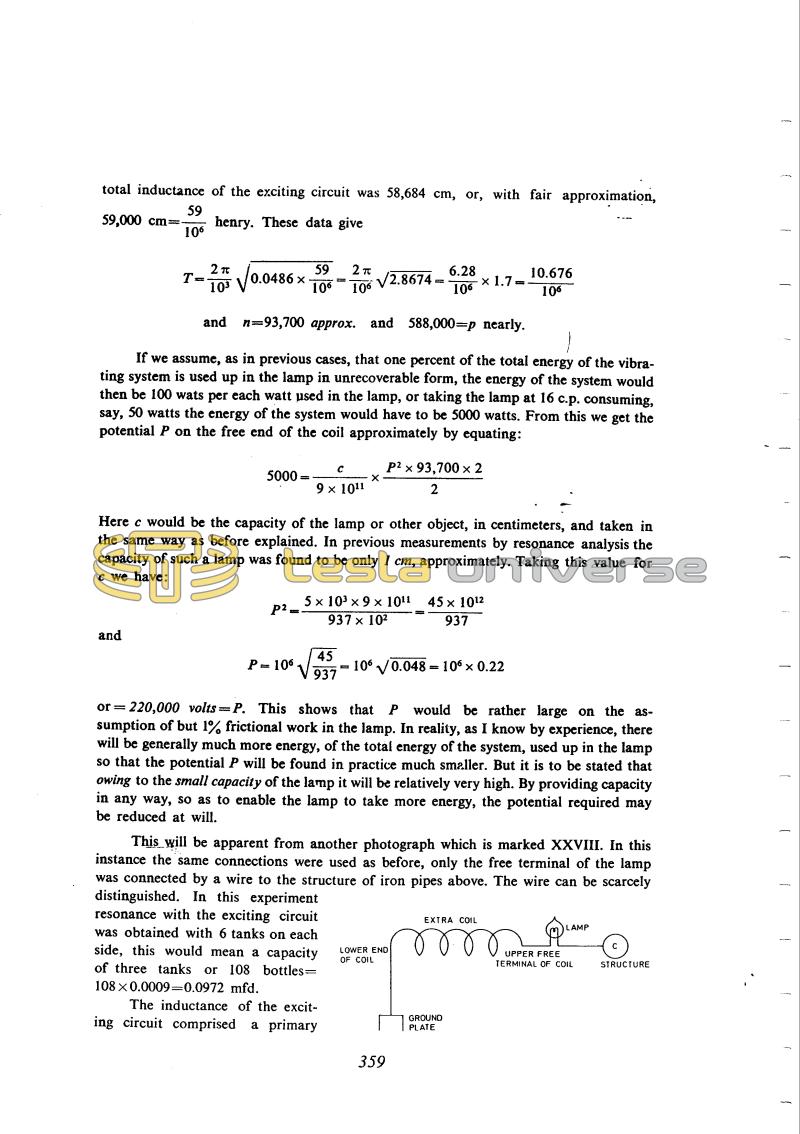 The explanation to Photograph XXII concerning the transmission of power from the excited primary circuit to the "extra coil" via the earth is similar to that he gave in 1893(6). The experiment to which the photograph refers was made with the aim of estimating the power of the oscillator from the thermal effect of the HF current. What Tesla calls the "total energy set in movement" would correspond to the total energy transferred to condenser in the secondary (i.e. the power) if an energy of !${1 \over 2}!$ CV2 is transferred in each half-cycle. It can be shown that the active power dissipated in the circuit is much less than this and is inversely proportional to the Q-factor of the oscillating circuit.